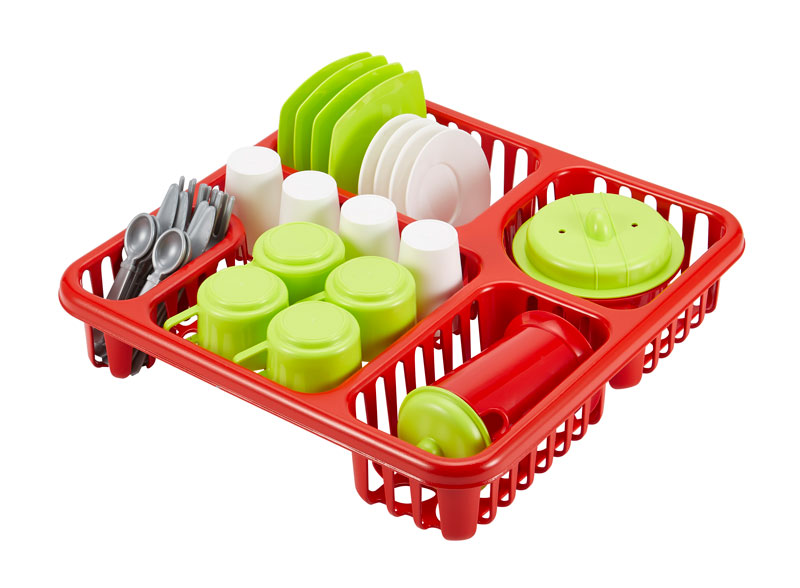 Набір посуду з сушкою складається з: 1 каструлі, чайника, набору чашок, стаканів, тарілок, блюдець та столових приборів на чотири персони. Все зручно розташовано в сушарці. Вік: від 18 міс. Розмір набору: 29,5 х 29,2 х 10 см.