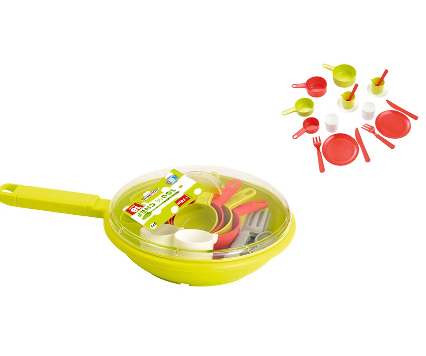 Набір посуду у пательні з чотирма ківшами, двома стаканами, чашками та двома тарілками і столовими приборами. Розмір (Д Ш В): 32 х 20 х 9 см.