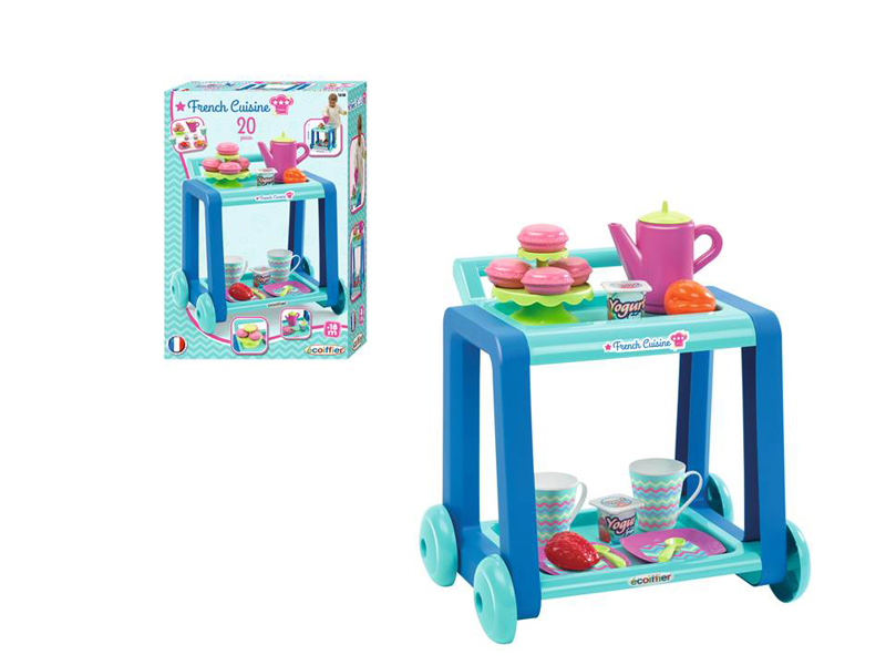 Возик French Cuisine з набором посуду та продуктами: чайник, стакани, ложки, чашки, тістечка на підставці, йогурти, фрукти.