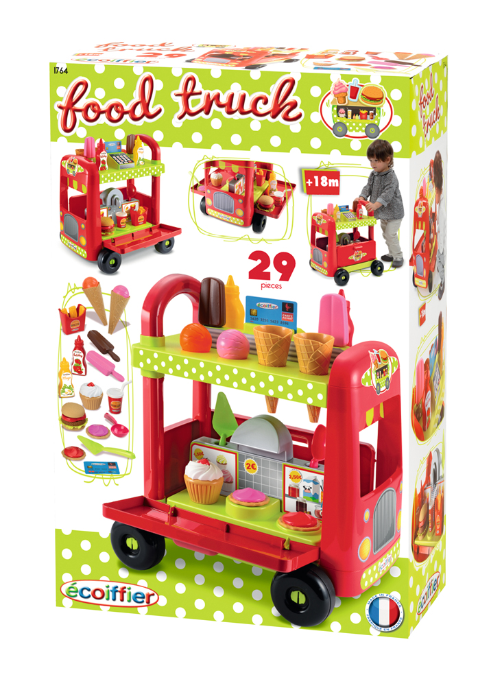 З возиком 2 в 1 ви одночасно маєте можливість відвідати кафе швидкого харчування та поласувати різноманітними солодощами. Набір продуктів складається з гамбургера, пакетика з картоплею, соусів, напою, тістечок, морозива у ріжку та на паличці, ложечки та лопаточки для морозива. В наборі 29 аксесуарів. Розмір: 41 х 30,5 х 45 см.