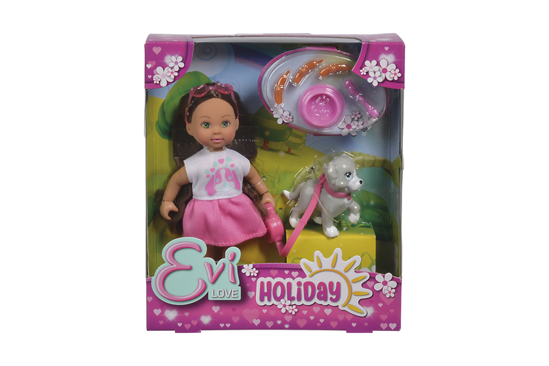 Ляльковий набір Еві "Холідей. Друг" з лялькою висотою 12 см, песиком та аксесуарами для годування песика. В комплекті сосиски, що з'єднуються в ланцюжок.
