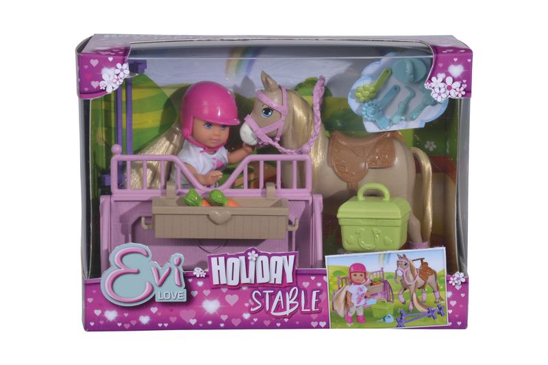 Ляльковий набір Еві "Холідей. Конюшня" з конячкою та аксесуарами для годування та догляду за конями. Еві на конюшні доглядає за конячкою. В комплекті конячка, загорожа, стайня та більш ніж 15 аксесуарів.