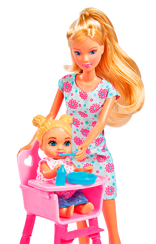 Штеффі з трьома дітьми мають все необхідне для прогулянок на вулиці та повсякденного побуту: коляску, ліжечко, стільчик для годування, пляшечки та пустушки. Для розваг малюків є ролоцикл, каталочка, іграшки.