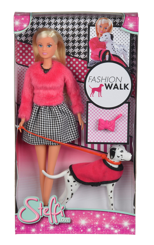 Лялька Штеффі одягнута в модне вбрання на прогулянці зі своїм улюбленцем-долматинцем в модній накидці.