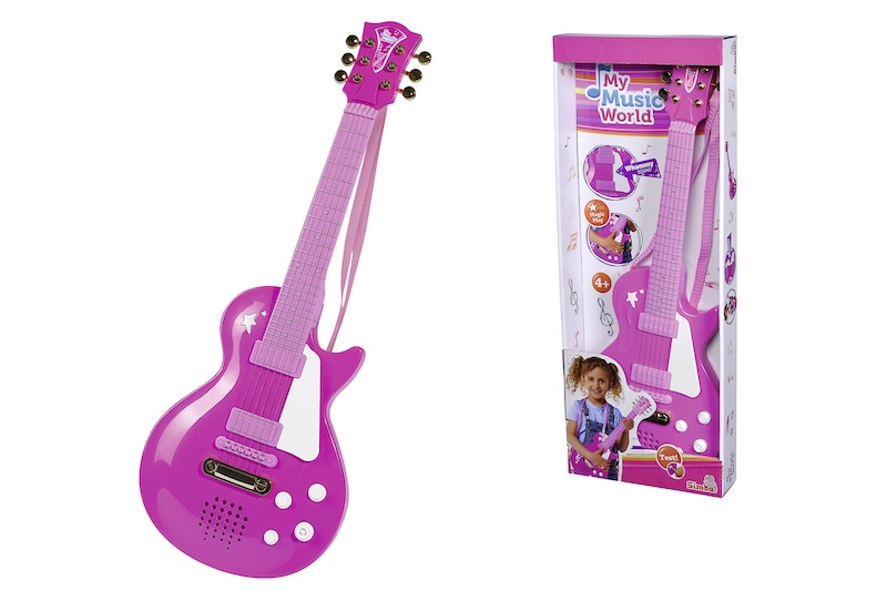 Електронна Рок-гітара у рожевому дівочому стилі зі справжніми металевими струнами. Розмір 56 см. Працює від батарейок 2 шт АА, йдуть до комплекту.