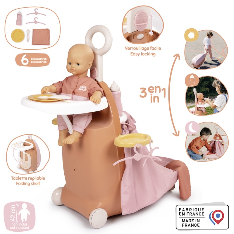 | Характеристика: - Ігровий набір "Бебi Ньорс. Теракотова пудра. Розкладна валіза 3 в 1; - валіза на двох коліщатах, обладнана ліжечком з балдахіном; - з зовнішнього боку валізки кріпиться стільчик для годування; - стільчик знімається та при транспортуванні фіксується на задній стінці валізи; - додаткові висувні полички для аксесуарів; - ліжечко підходить для пупса висотою до 32 см (пупс не входить до комплекту); - ручка, завдяки якій, валізу зручно перевозити; - аксесуари: ковдра, 2 вішалки, тарілочка, ложка, пляшечка. - розміри: 62 х 26 х 40 см. Рекомендований вік: від 18 місяців. Зроблено з любов’ю у Франції. |