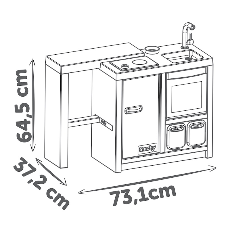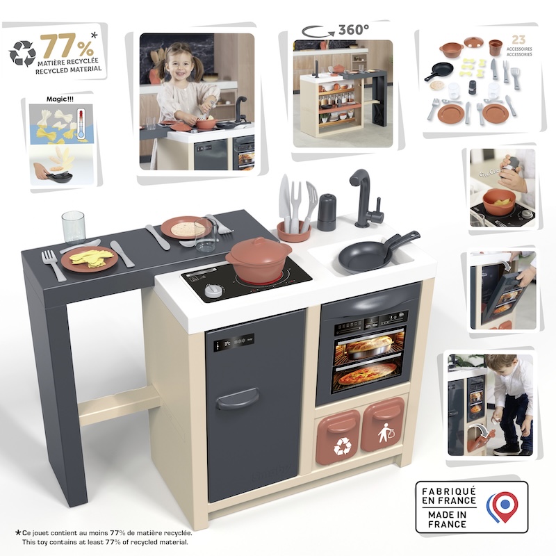 Характеристика: - Кухонний острів "Скандинавський стиль" з ігровою зоною 360; - 1 конфорочка плита; - духова шафа; - холодильник; - мийка; - боковий стіл для обіду; - 2 контейнери для розділення відходів; 23 аксесуарів: каструлька з кришкою, тарілки, столові прилади, сковорідка, стакан, млинець (одна сторона підсмажена, інша сира), 5 чутливих до тепла локшини, які змінюють колір у холодній воді, 1 млин для солі та перцю з функцією Cric-Cric, та інше; - нова кольорова гама; Розміри: 64,5 х 37 х 73 см. Вік від 3 років. |