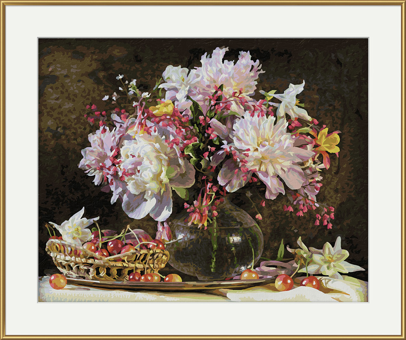 Картина з сюжетом «Букет квітів з вишнями» показує художньо оформлений букет квітів в скляній вазі зі свіжозібраним вишнями в плетеному кошику. Мотив привертає глядача майстерно розрахованими структурами і жвавій колірної грою. З кожним мазком пензля картина все більше буде розкривати свої секрети. Картини за номерами Schipper підходять як для дітей, так і для дорослих, які люблять малювати або хочуть цього навчитися. Процес малювання за номерами дуже простий: необхідно лише підбирати потрібні для кожного номера фарби і наносити їх на картон з контуром малюнка. На кожній баночці вказаний відповідний номер кольору. У набір входять: картина 40 х 50 см, акрилові фарби, пензлик, інструкція, перевірки лист.